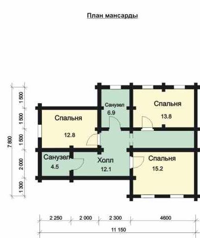 İkinci katta: спальни 13,8, 15,2 и 12,8 м², санузлы 4,5 и 6,9 м², холл 12,1 м².