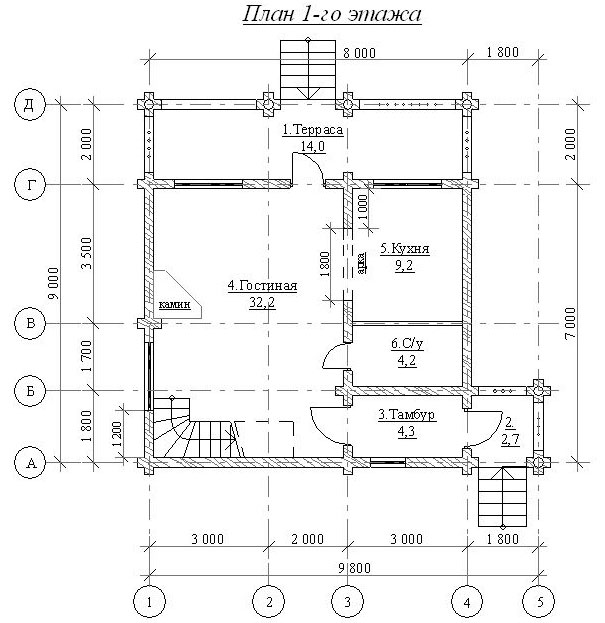 Birinci katta: веранда терраса 14 м², кухня 9,2 м², санузел 4,2 м², тамбур 4,3 м², крыльцо 2,7 м², гостиная 32,2 м².